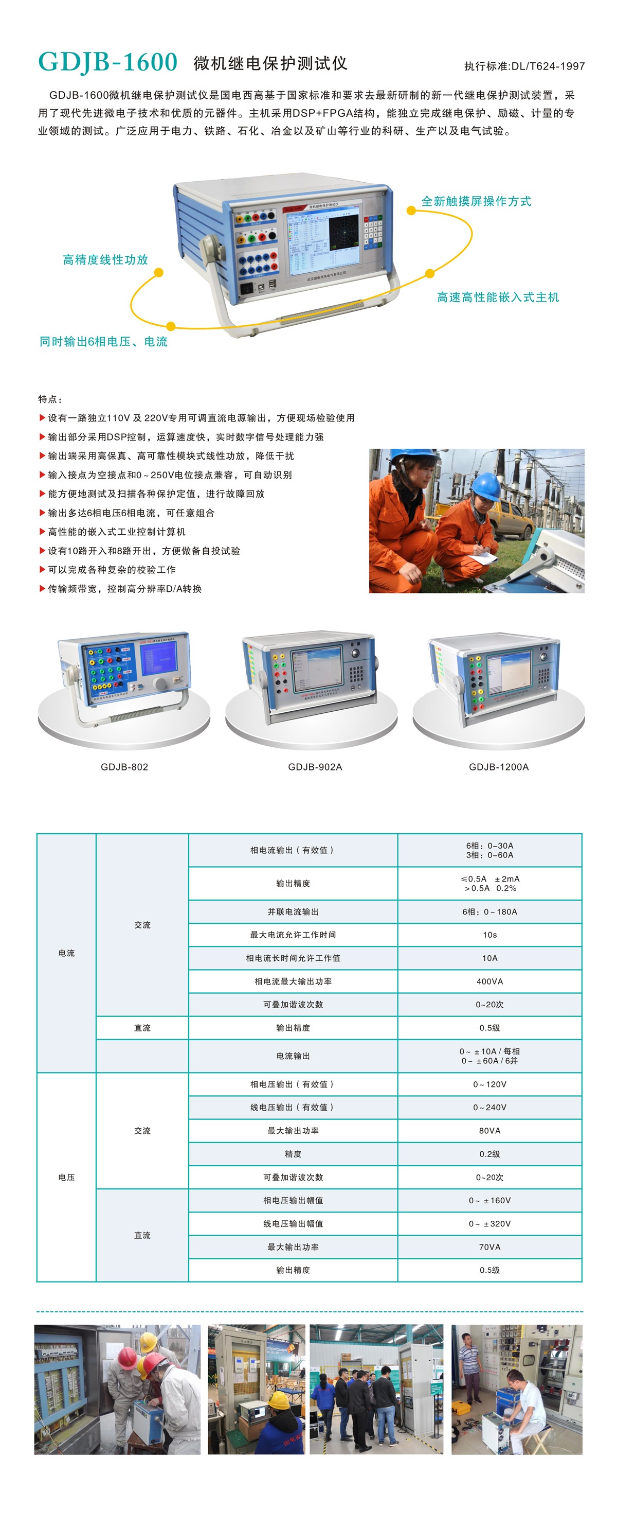 GDJB -1600多功能微機繼電保護測試系統(tǒng)是國電西高公司參照中華人民共和國電力行業(yè)標(biāo)準(zhǔn)《DL/T624-1997 繼電保護微機型試驗裝置技術(shù)條件》,在廣泛聽取用戶意見和GDJB-1200的基礎(chǔ)上,認(rèn)真總結(jié)多年積累的產(chǎn)品開發(fā)和生產(chǎn)經(jīng)驗,采用目前最新的電子技術(shù)研制的新一代微機繼電保護測試裝置,可以獨立完成繼電保護、勵磁、 計量等專業(yè)領(lǐng)域內(nèi)的裝置和元器件測試調(diào)試,微機繼電保護測試儀廣泛適用于電力、鐵路、石化、 冶金和礦山等行業(yè)的科研、生產(chǎn)和電氣試驗現(xiàn)場。